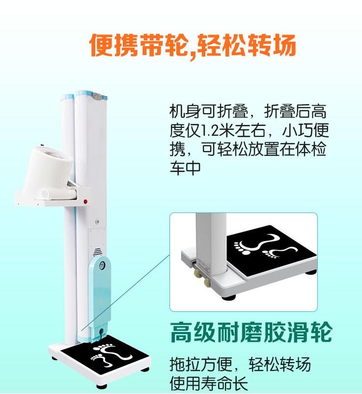 SH-600GX為便攜式身高體重血壓心率一體機,專(zhuān)為“上山下鄉”而設計,它的一大亮點(diǎn)就是折疊帶輪,折疊后僅1.2米,這一點(diǎn)彌補了多數健康一體機無(wú)法折疊的囧況,完美解決了下鄉體檢、折疊裝車(chē)難、移動(dòng)轉場(chǎng)難的問(wèn)題。